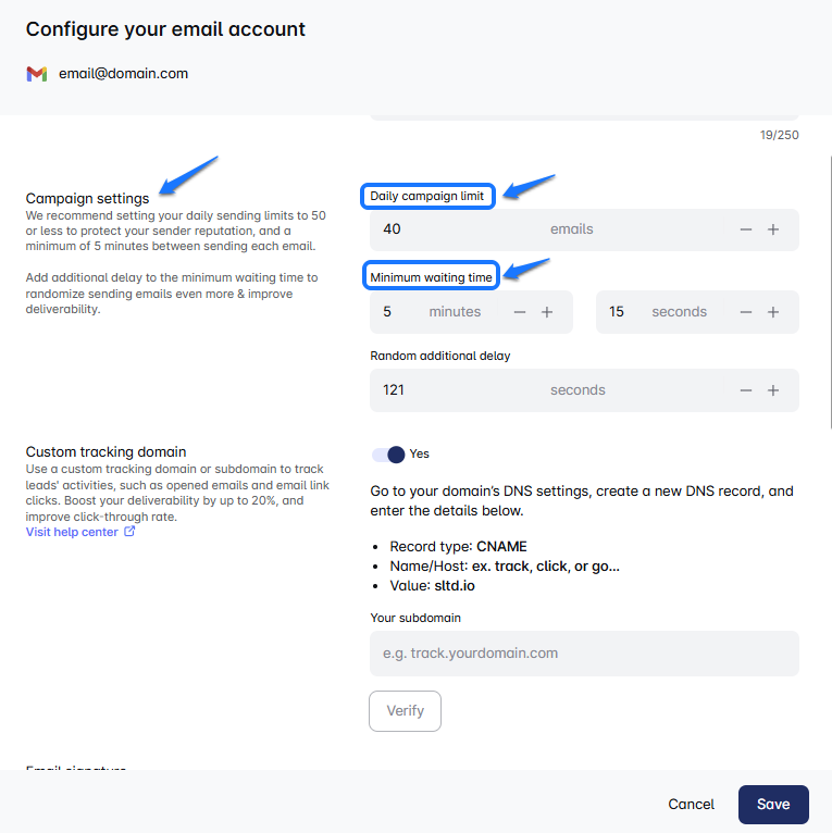 A custom tracking domain is important because it makes your email links look more professional and helps build trust with your prospects. Plus, it improves deliverability by aligning your links with your brand, which email servers like.