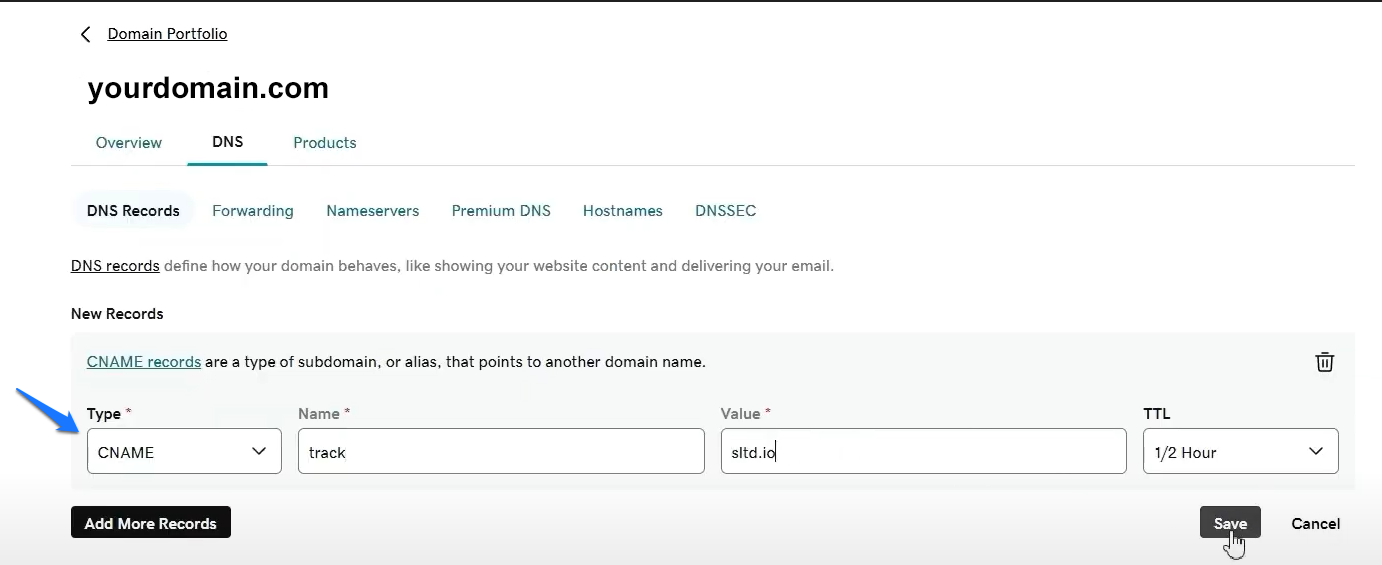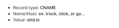 - Since we’re creating a subdomain, you need to use the prefix you’ve created (e.g., track, click, go, etc.) and paste it into SLS Outreach Kampagnen Manager under the Your subdomain field.